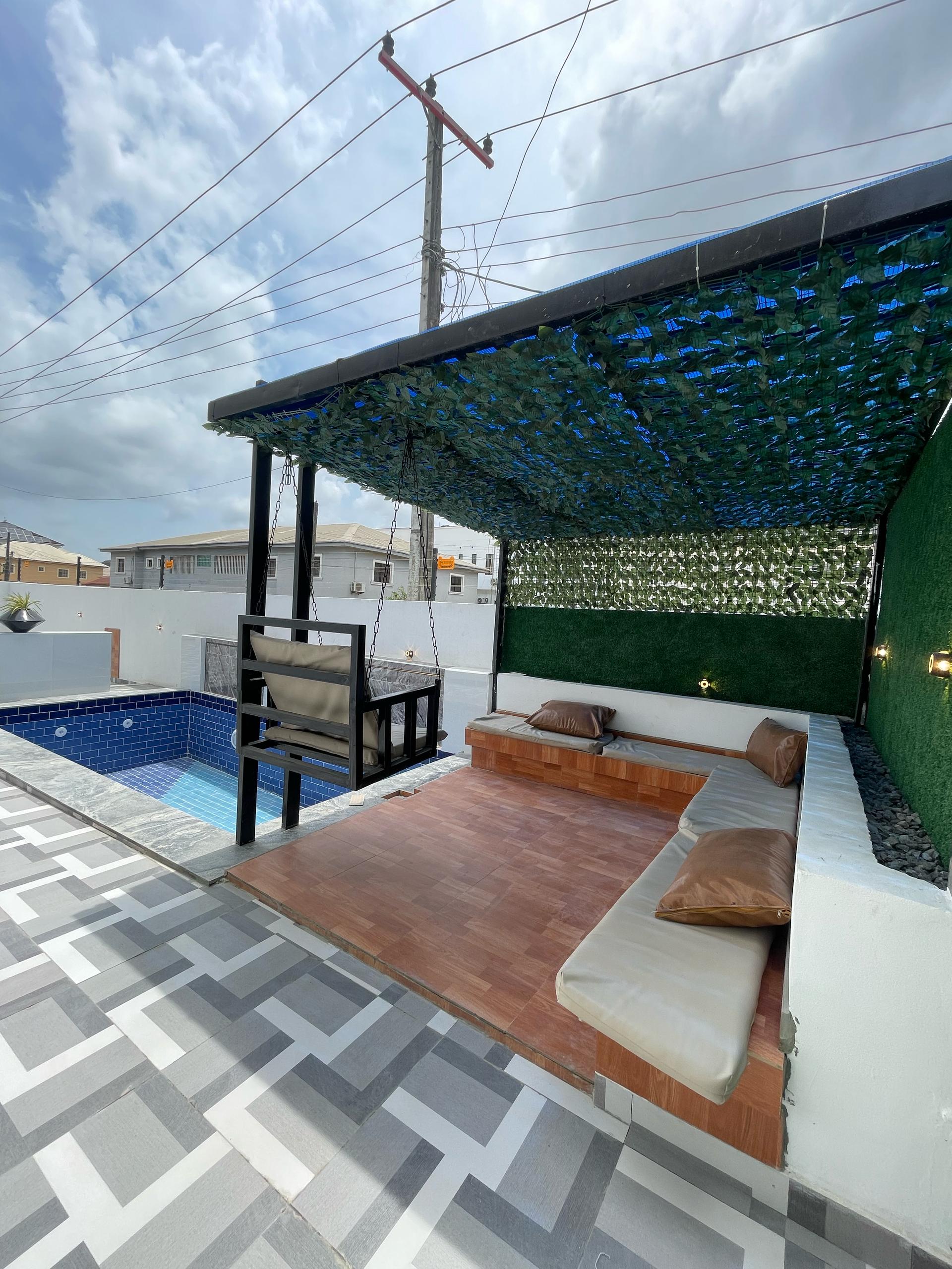 The family lounge offers a cozy yet stylish space for relaxation and entertainment, complemented by inbuilt Bluetooth speakers for an immersive sound experience. The house includes a spacious BQ (Boys’ Quarters) for added convenience and flexibility. perfect for relaxation or hosting guests, surrounded by a stamped concrete floor that adds a sleek touch to the outdoor area.