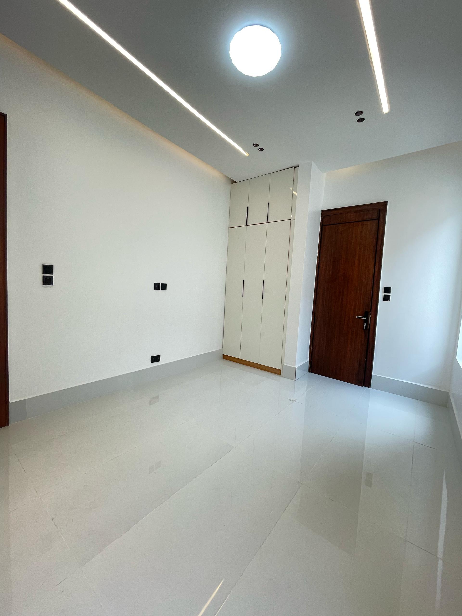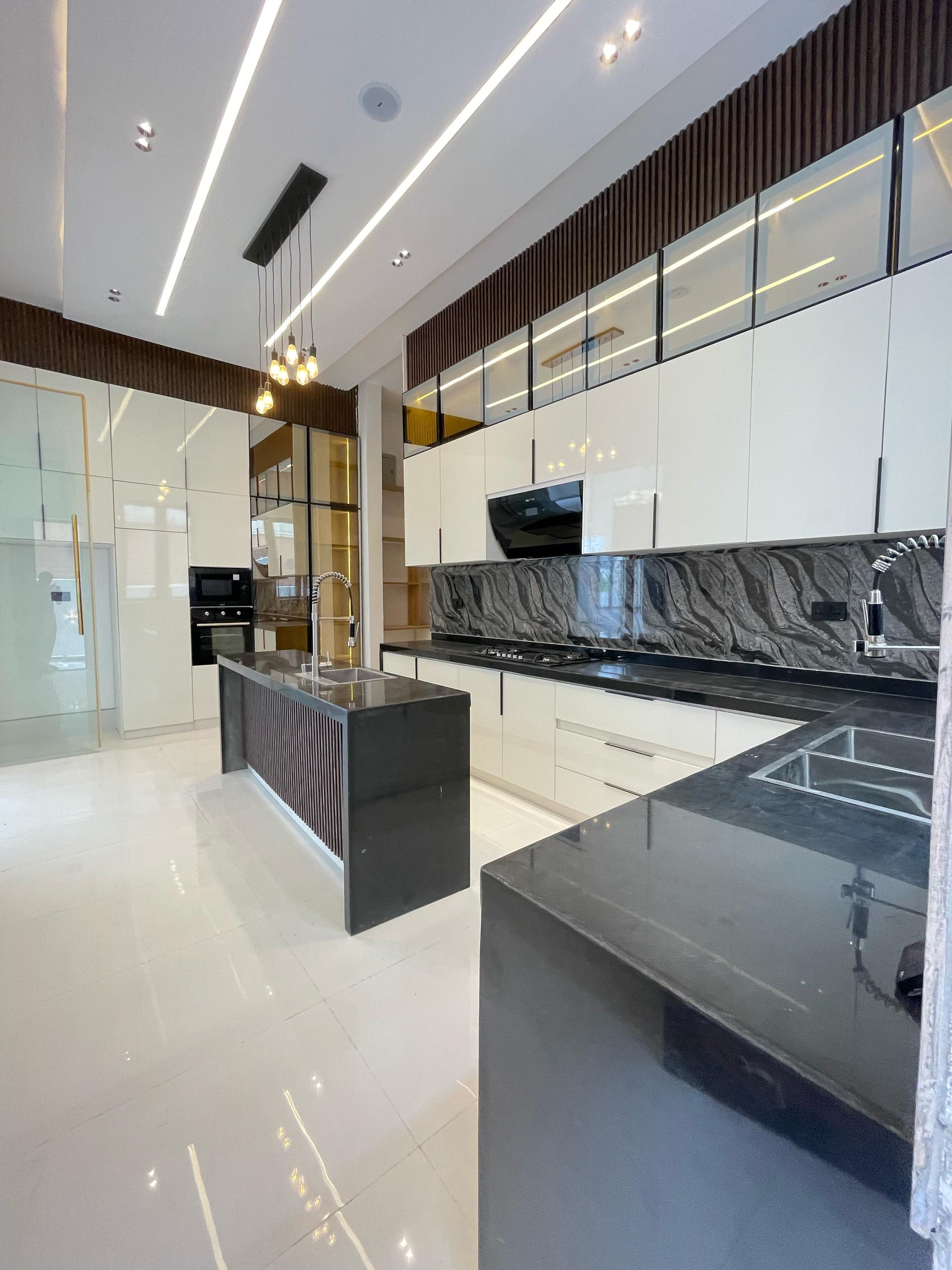From the moment you enter, the spacious foyer sets the tone for the grandeur that unfolds. All five bedrooms are ensuite, featuring high-quality finishes, POP ceilings, and recessed LED lights that enhance the interior elegance. The fully fitted kitchen comes with state-of-the-art appliances, catering to both casual and gourmet cooking needs, while the dining area, highlighted by elegant chandeliers, provides a beautiful setting for family meals.