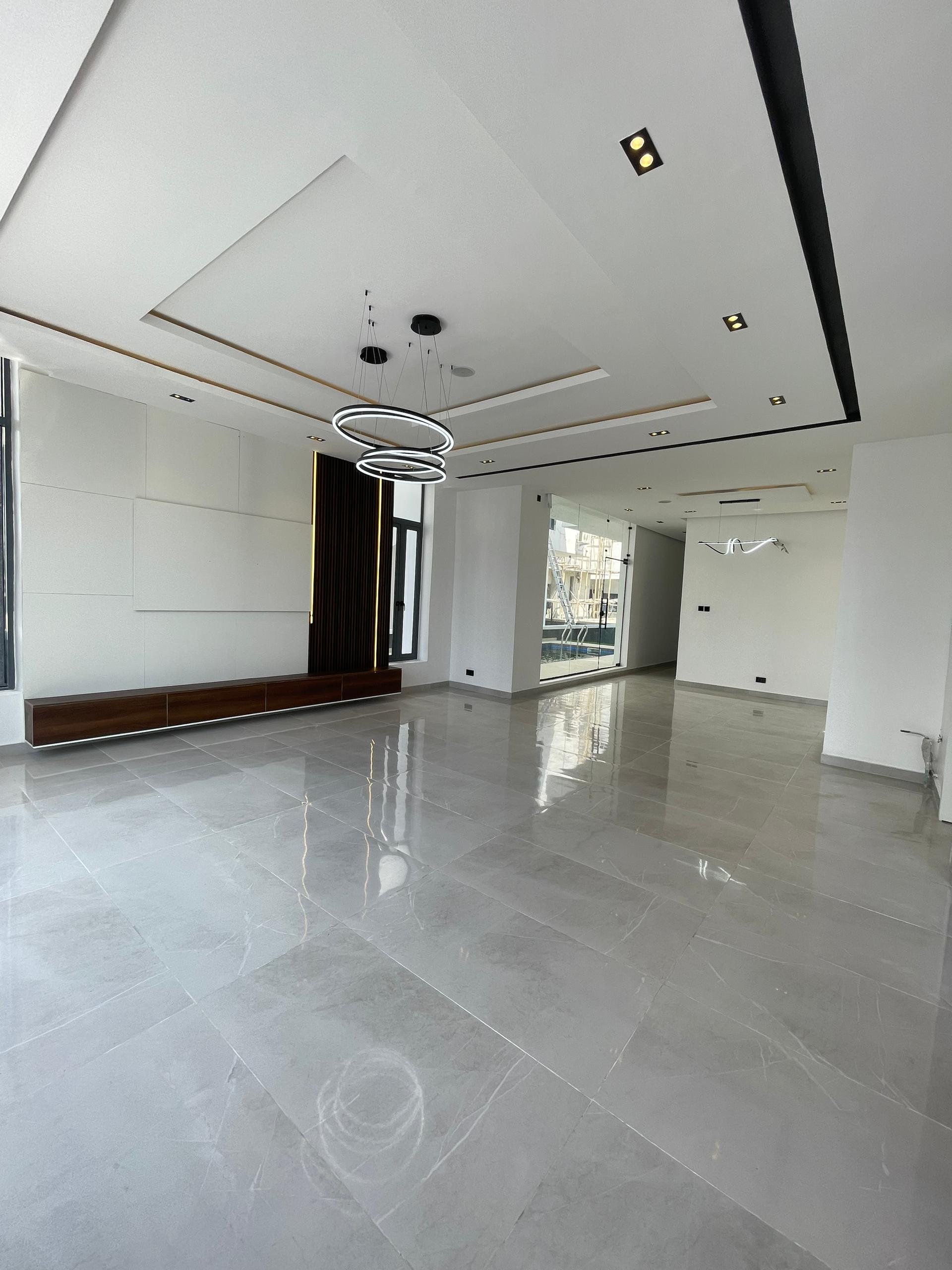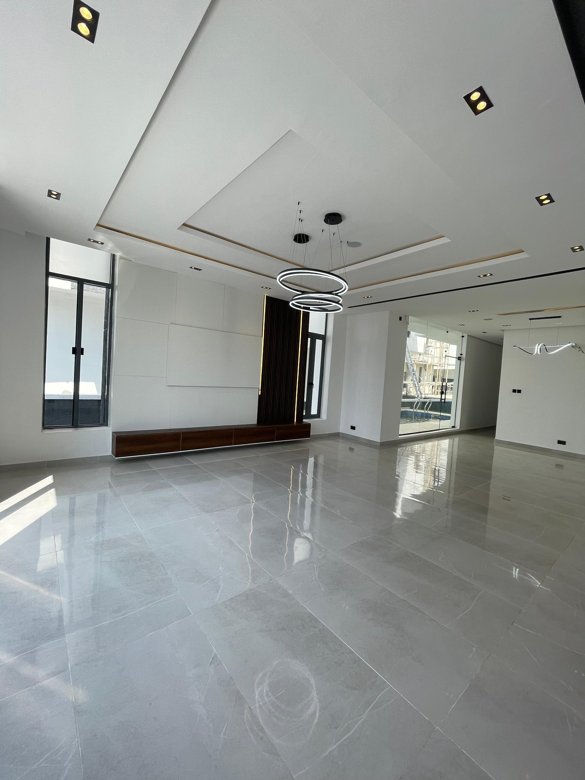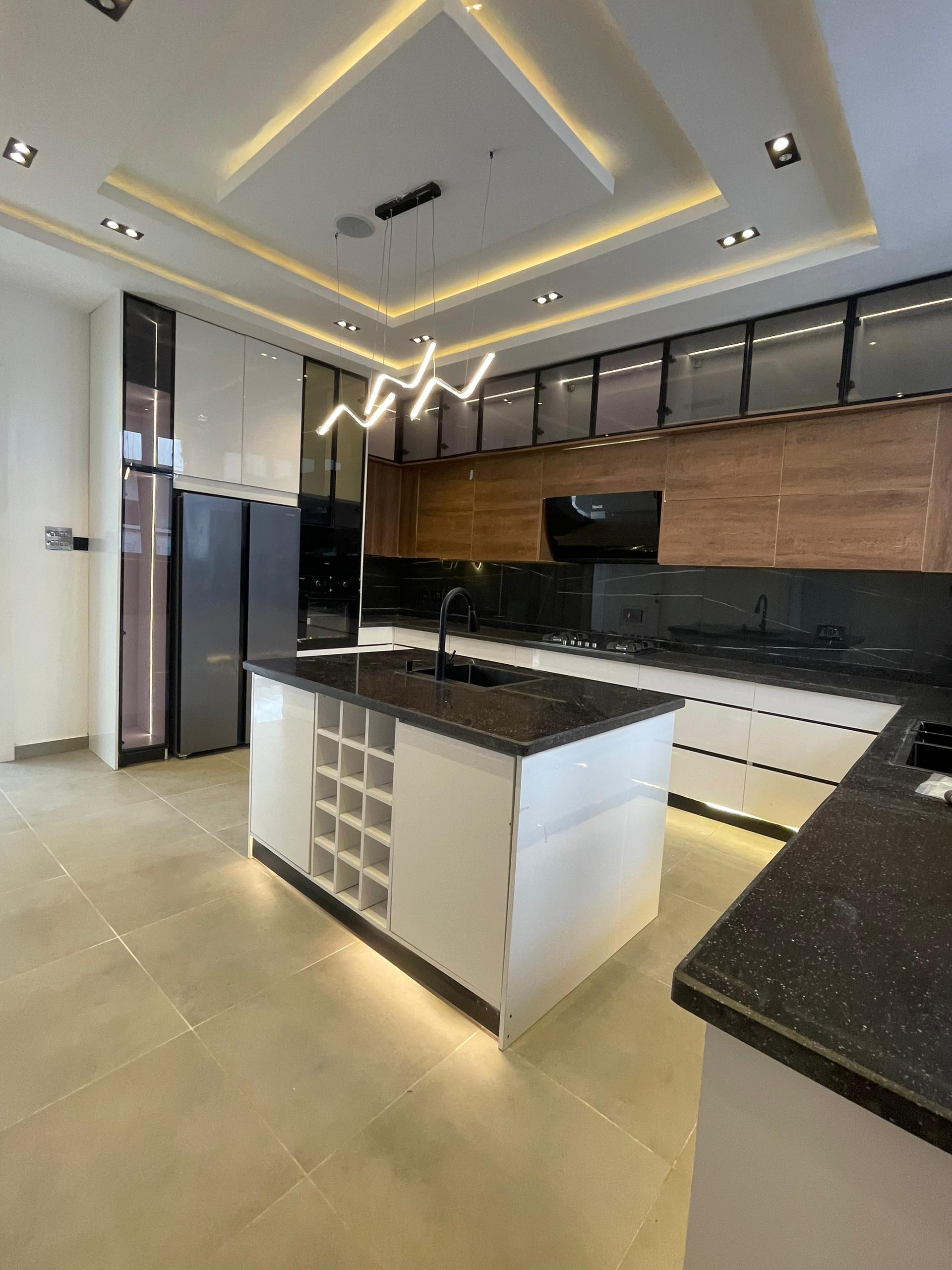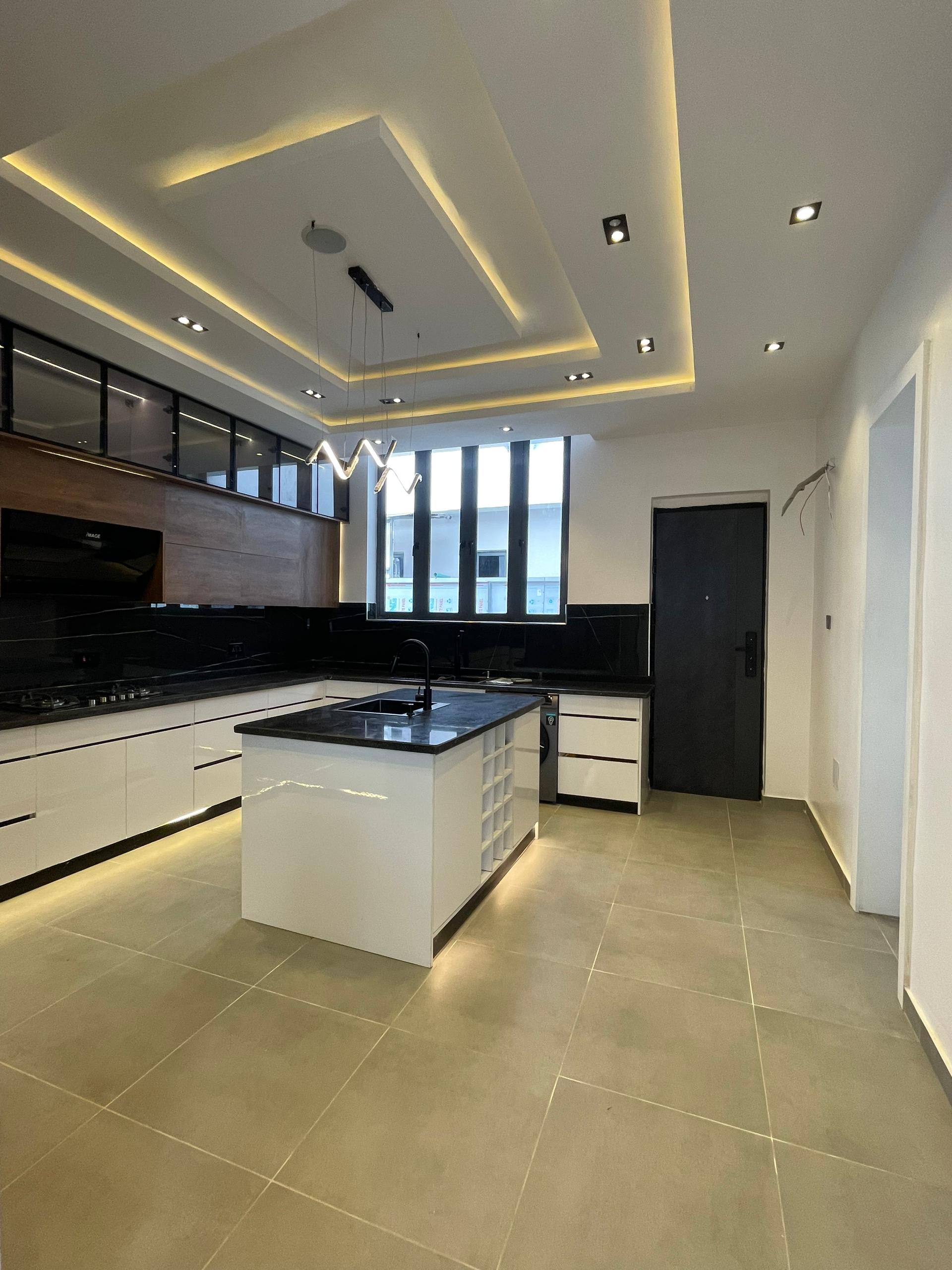 From the moment you enter, the spacious foyer sets the tone for the grandeur that unfolds. All five bedrooms are ensuite, featuring high-quality finishes, POP ceilings, and recessed LED lights that enhance the interior elegance. The fully fitted kitchen comes with state-of-the-art appliances, catering to both casual and gourmet cooking needs, while the dining area, highlighted by elegant chandeliers, provides a beautiful setting for family meals.