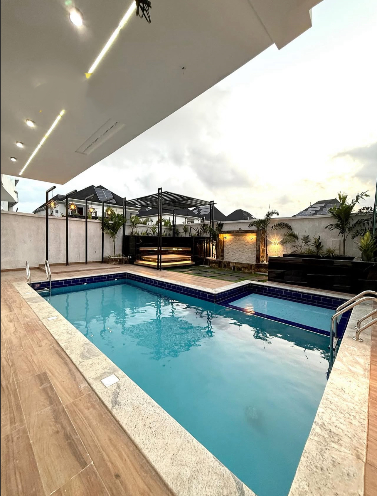 Step out to a tranquil swimming pool, perfect for cooling off or lounging in style.