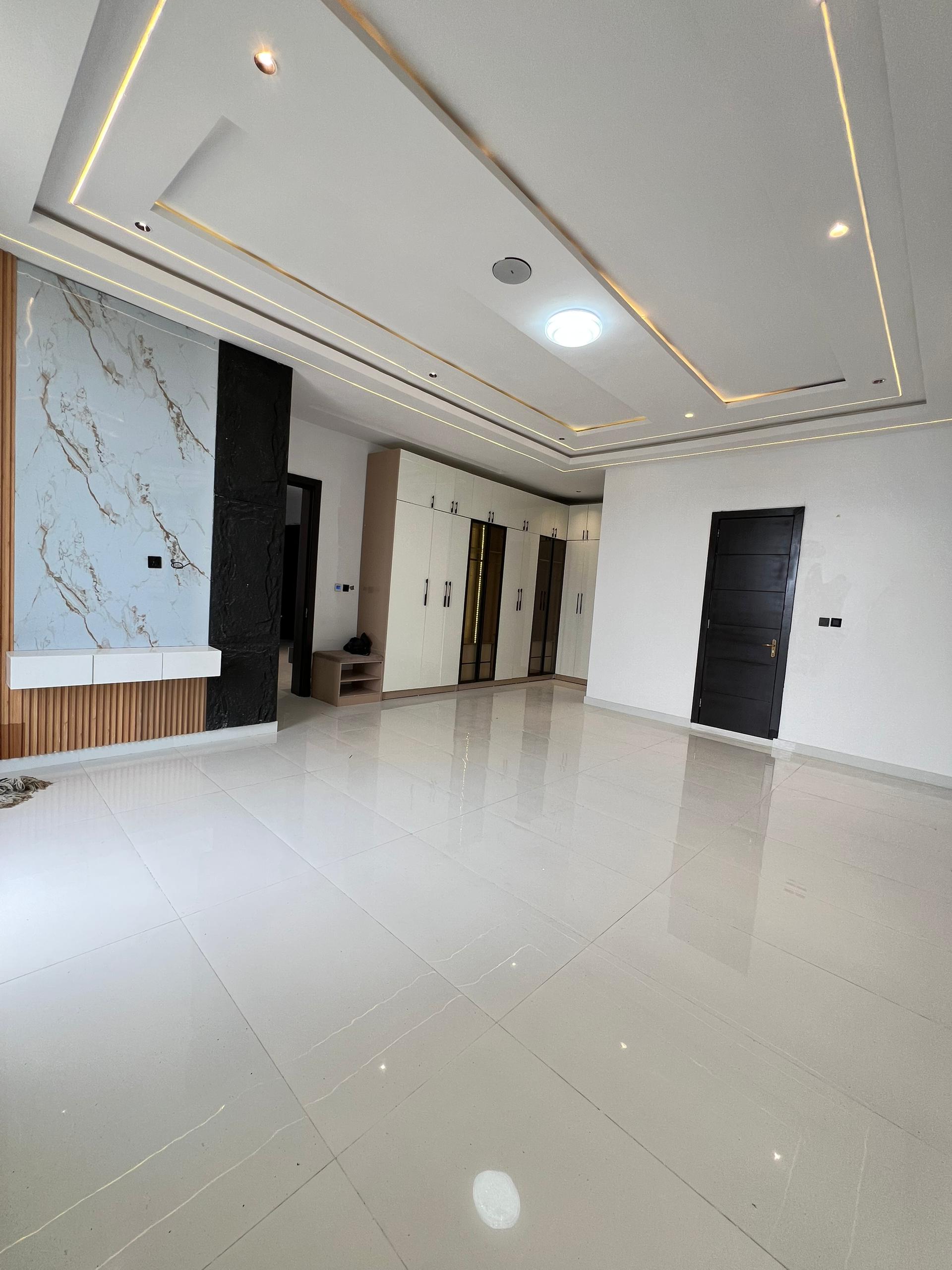 From the moment you enter, the spacious foyer sets the tone for the grandeur that unfolds. All five bedrooms are ensuite, featuring high-quality finishes, POP ceilings, and recessed LED lights that enhance the interior elegance. The fully fitted kitchen comes with state-of-the-art appliances, catering to both casual and gourmet cooking needs, while the dining area, highlighted by elegant chandeliers, provides a beautiful setting for family meals.