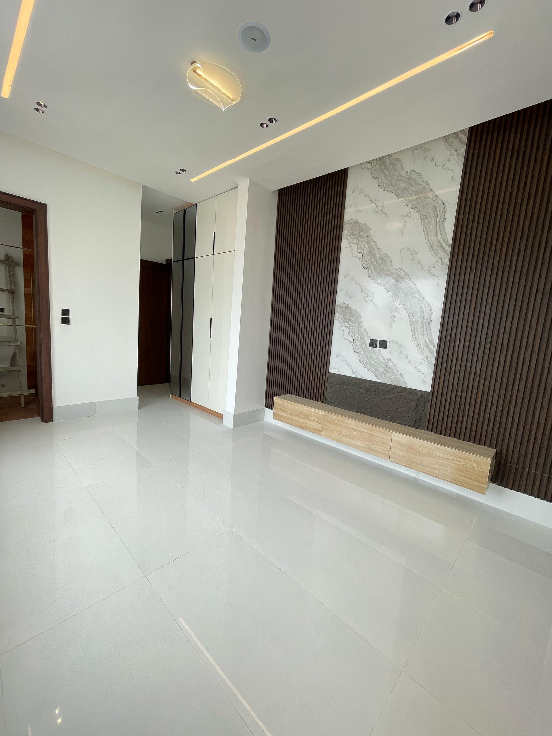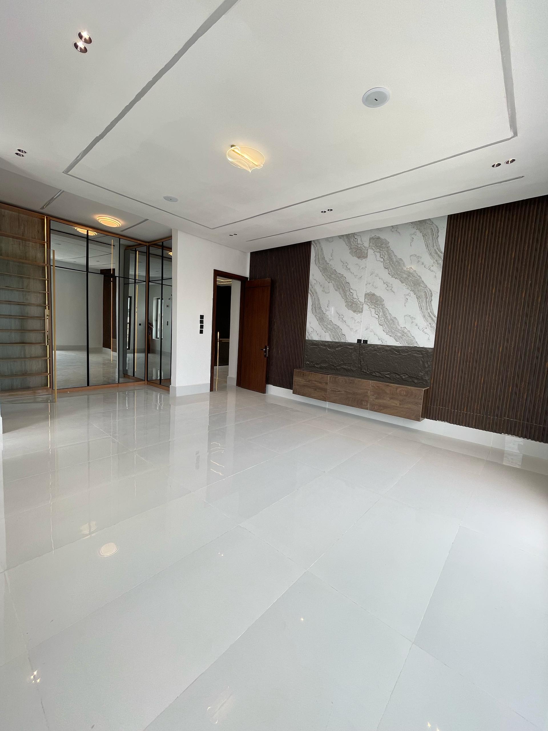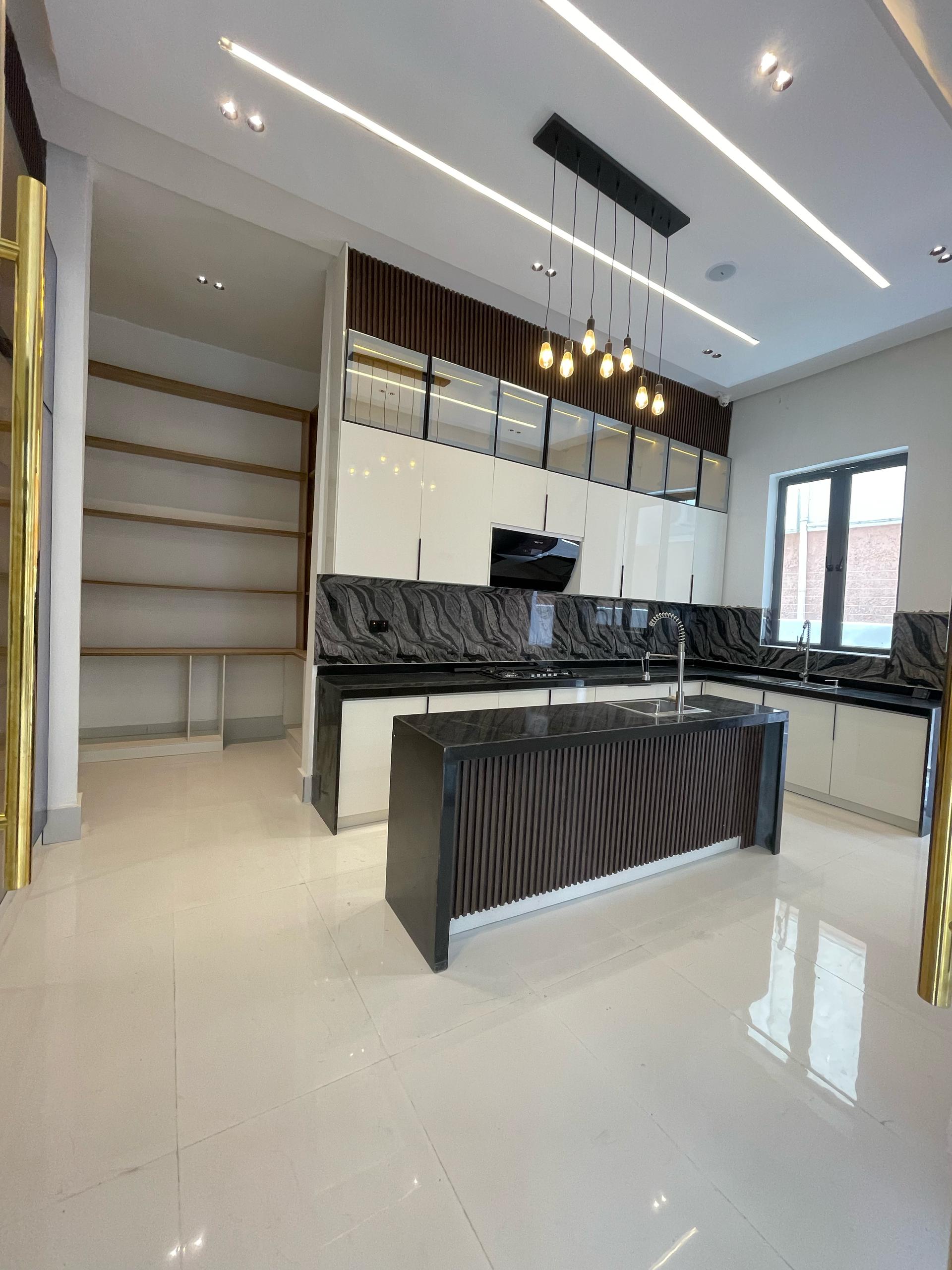 From the moment you enter, the spacious foyer sets the tone for the grandeur that unfolds. All five bedrooms are ensuite, featuring high-quality finishes, POP ceilings, and recessed LED lights that enhance the interior elegance. The fully fitted kitchen comes with state-of-the-art appliances, catering to both casual and gourmet cooking needs, while the dining area, highlighted by elegant chandeliers, provides a beautiful setting for family meals.